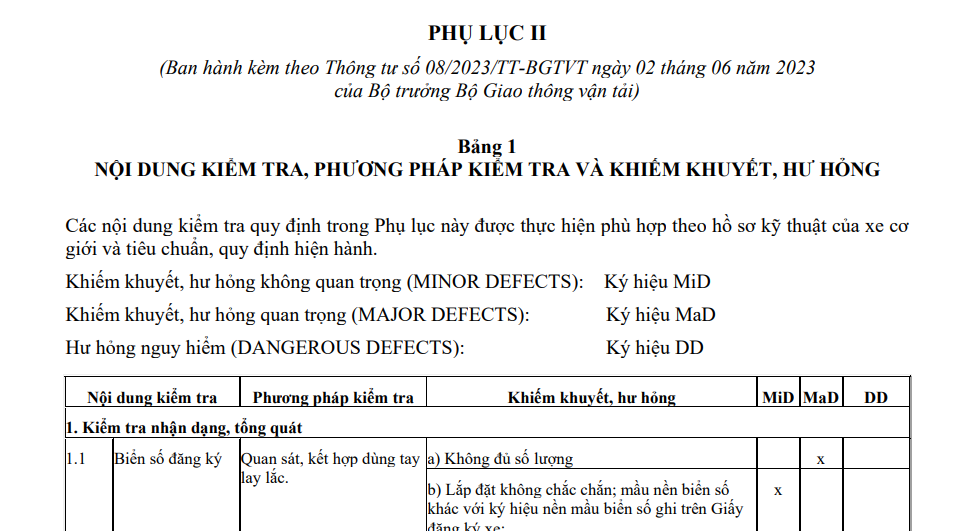 Nội dung kiểm tra, phương pháp kiểm tra và khiếm khuyết, hư hỏng xe cơ giới